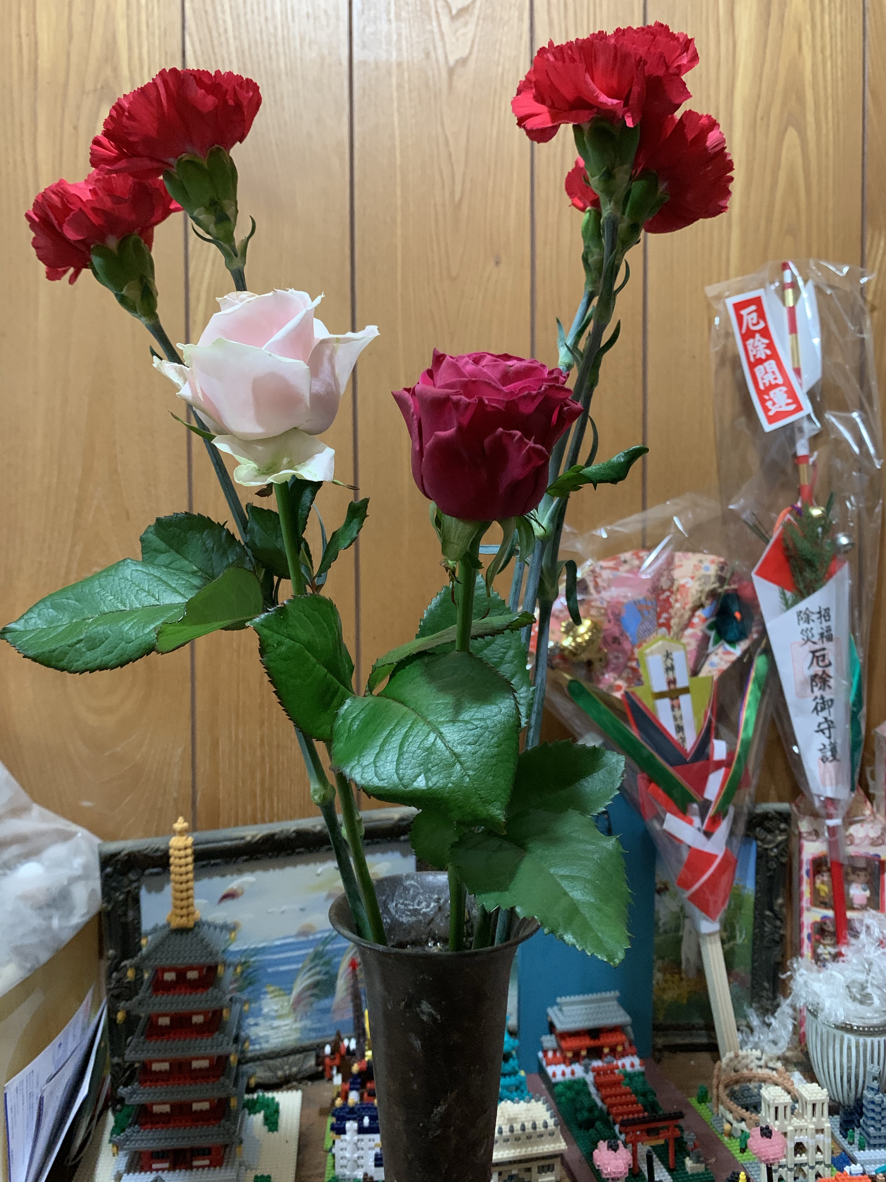 カーネーションとバラの切り花を
