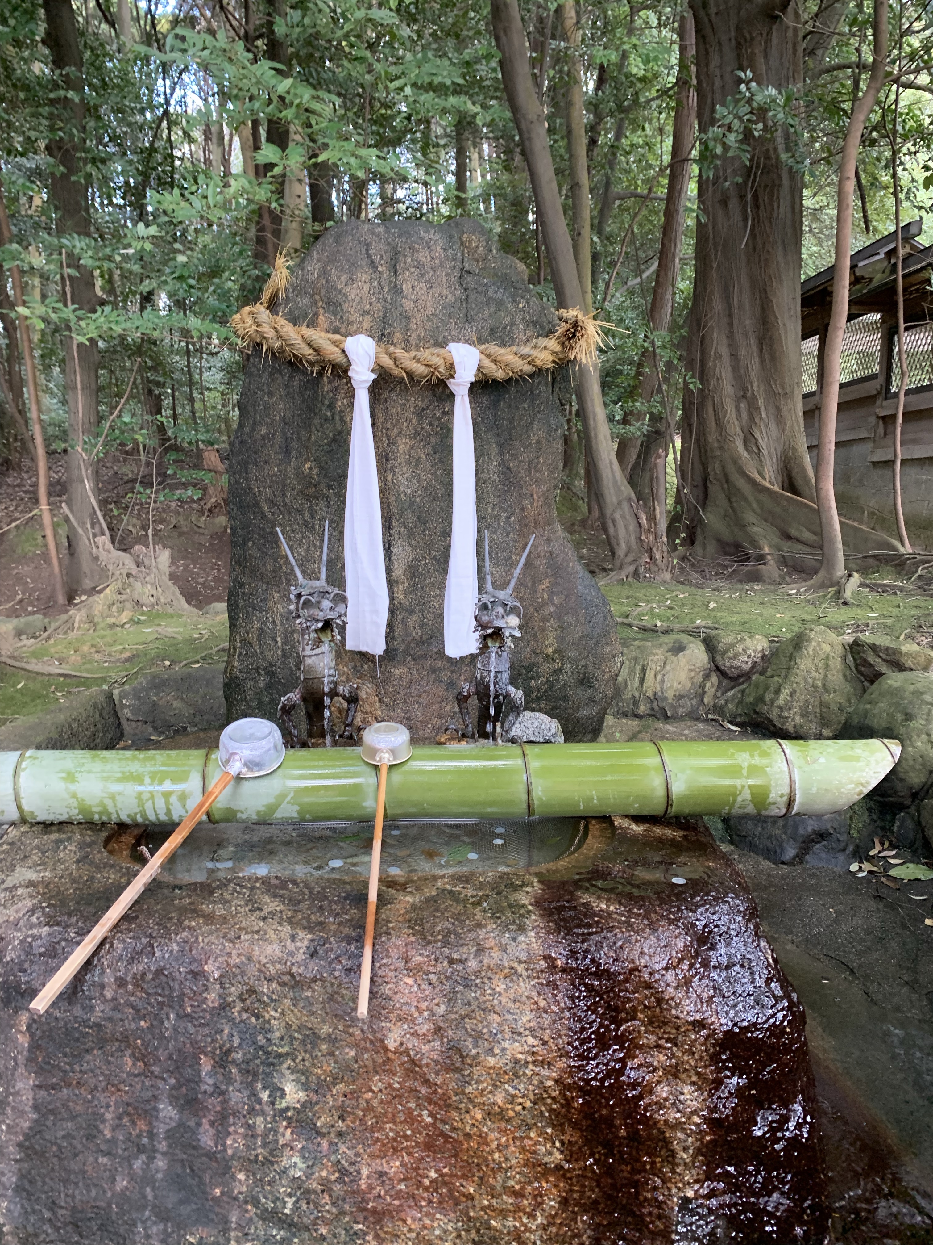 注連縄の張られた神石に水を注いで